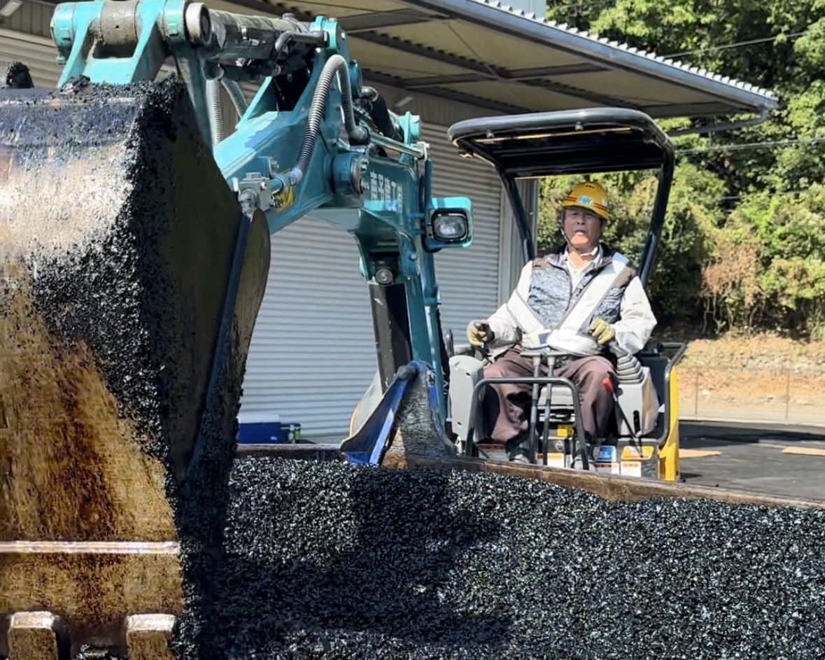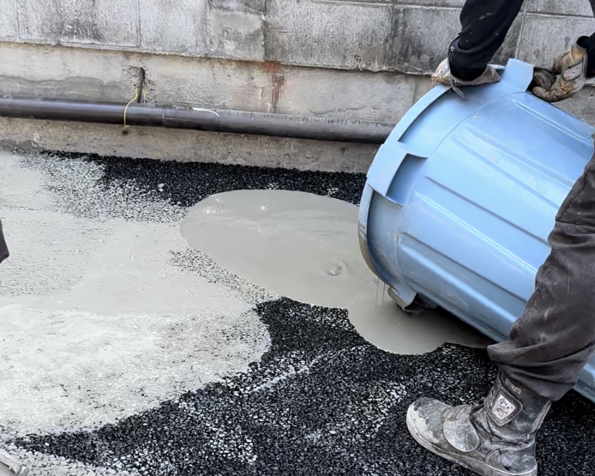 空隙の多い透水性のアスファルト合材にセメントミルク注入を行いました。