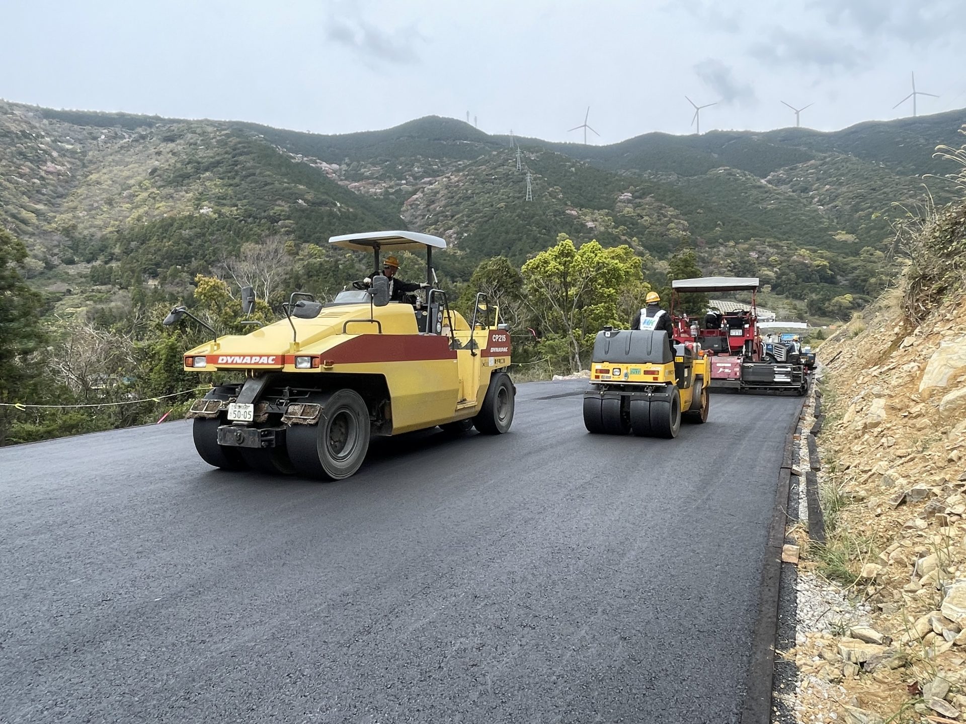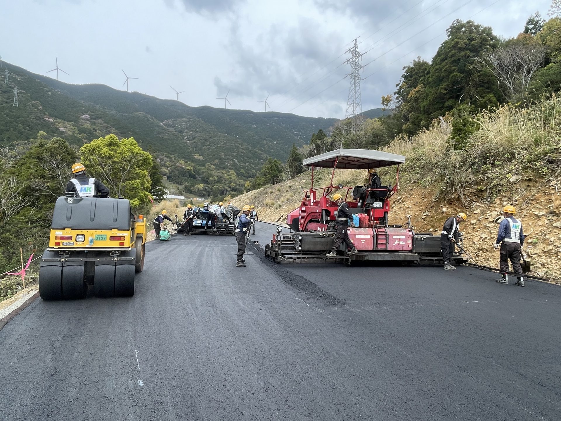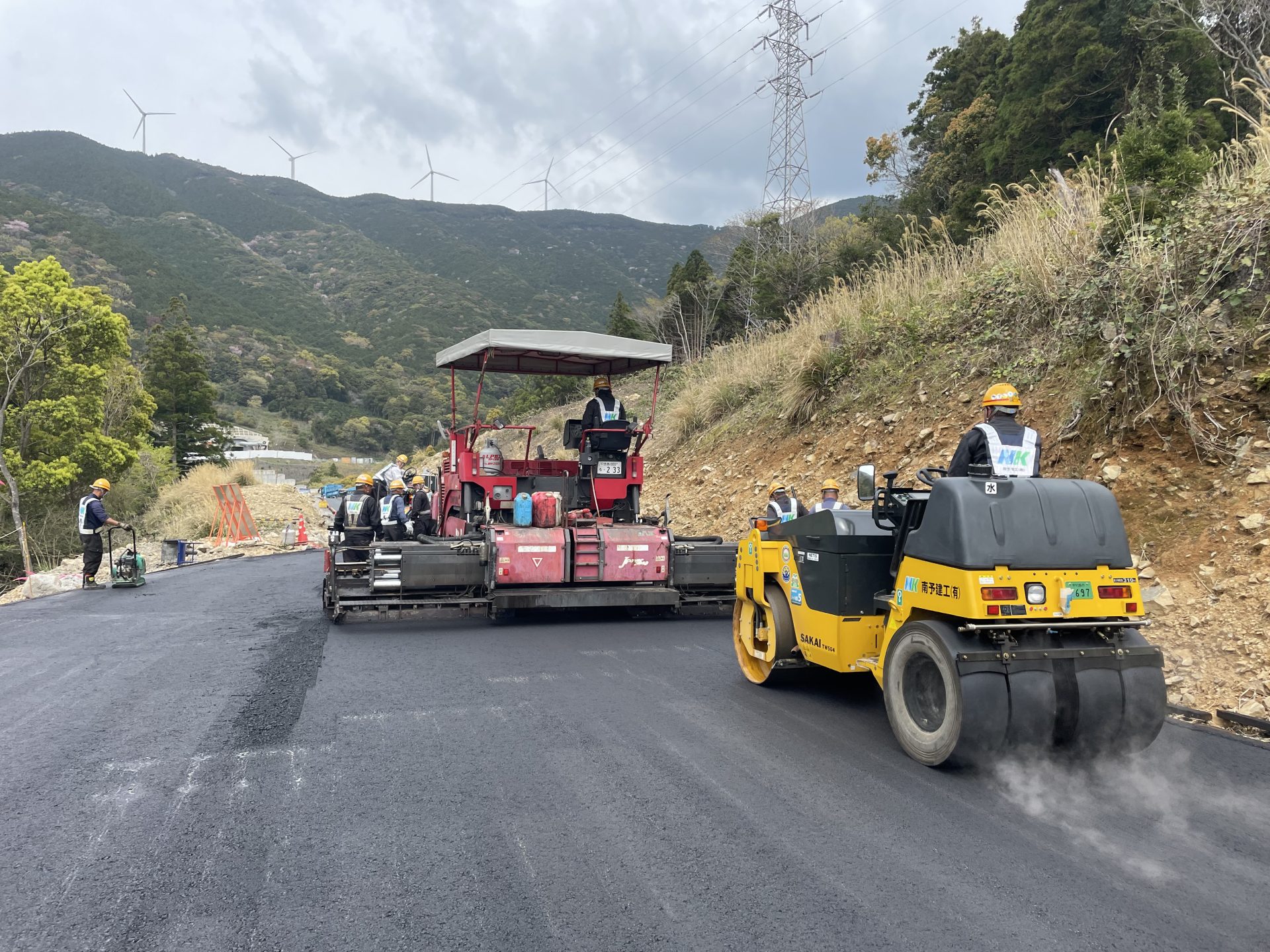 #アスファルト舗装#道路工事 愛南町柏新内海トンネル工事用道路 2023年3月 愛南町柏 新内海トンネル工事用道路を施工しました。 大型道路計画の工事迂回路です。 アスファルトフィニッシャ2台同時施工で仕上がり良好でした。 一覧に戻る
