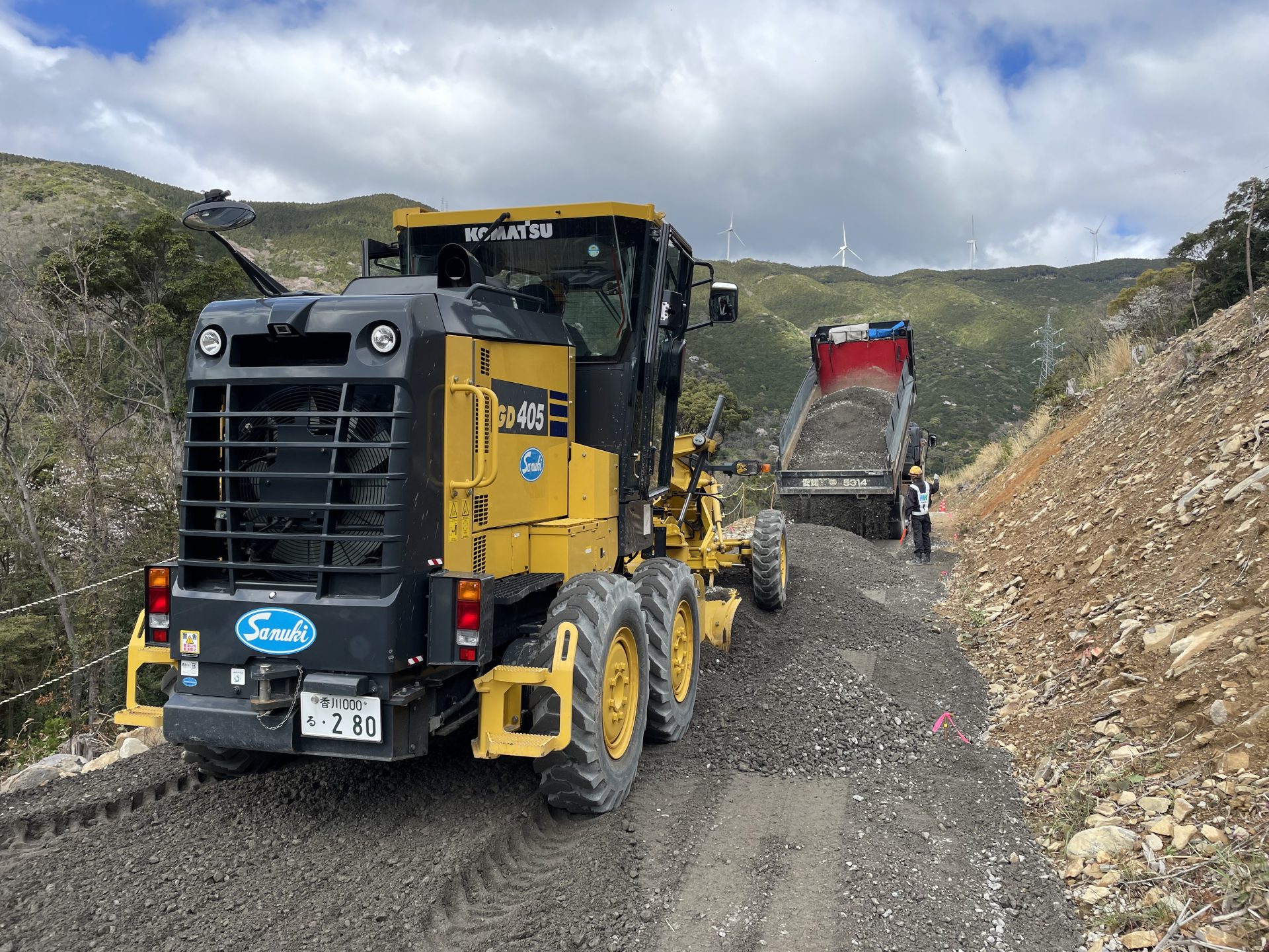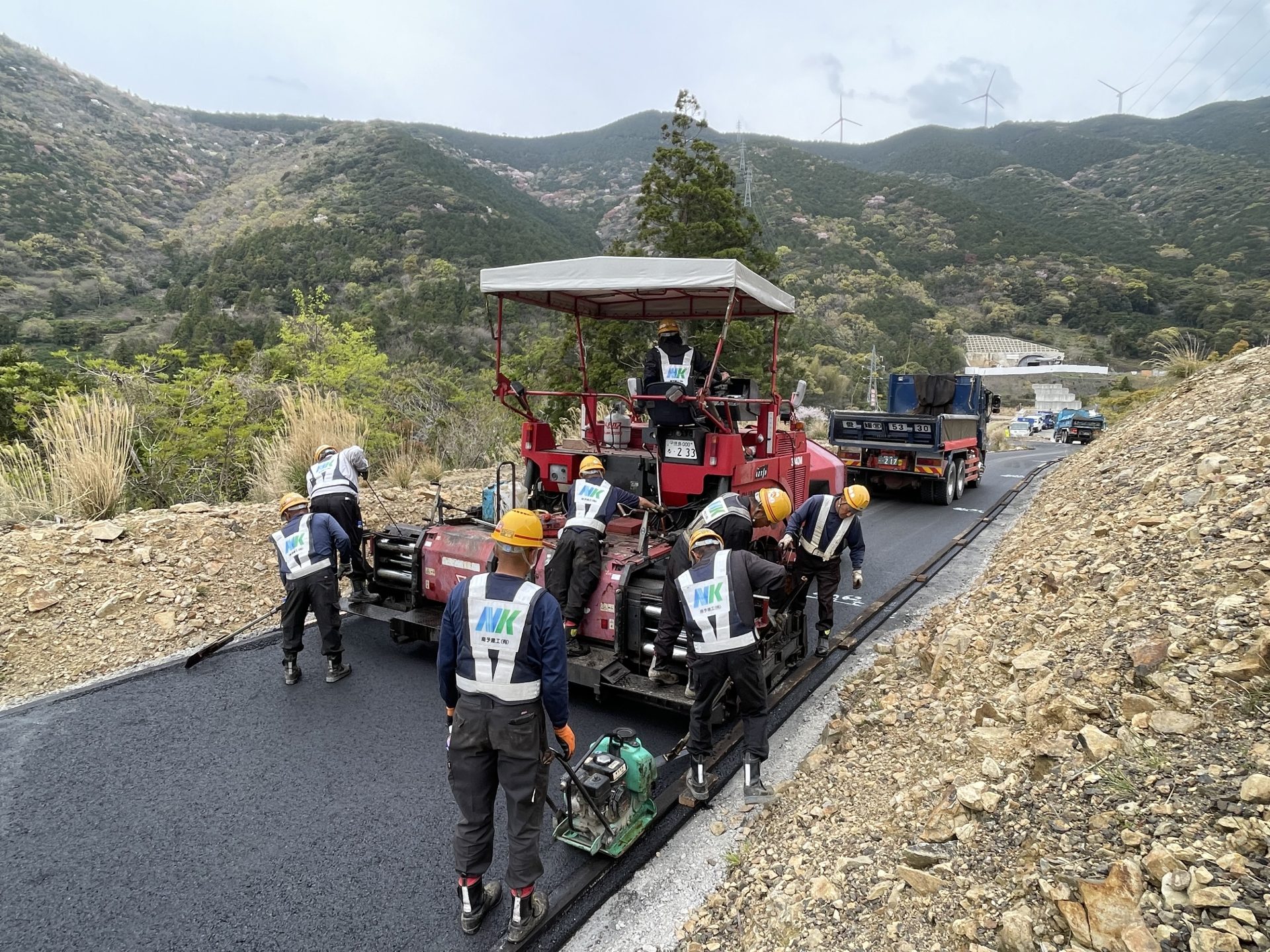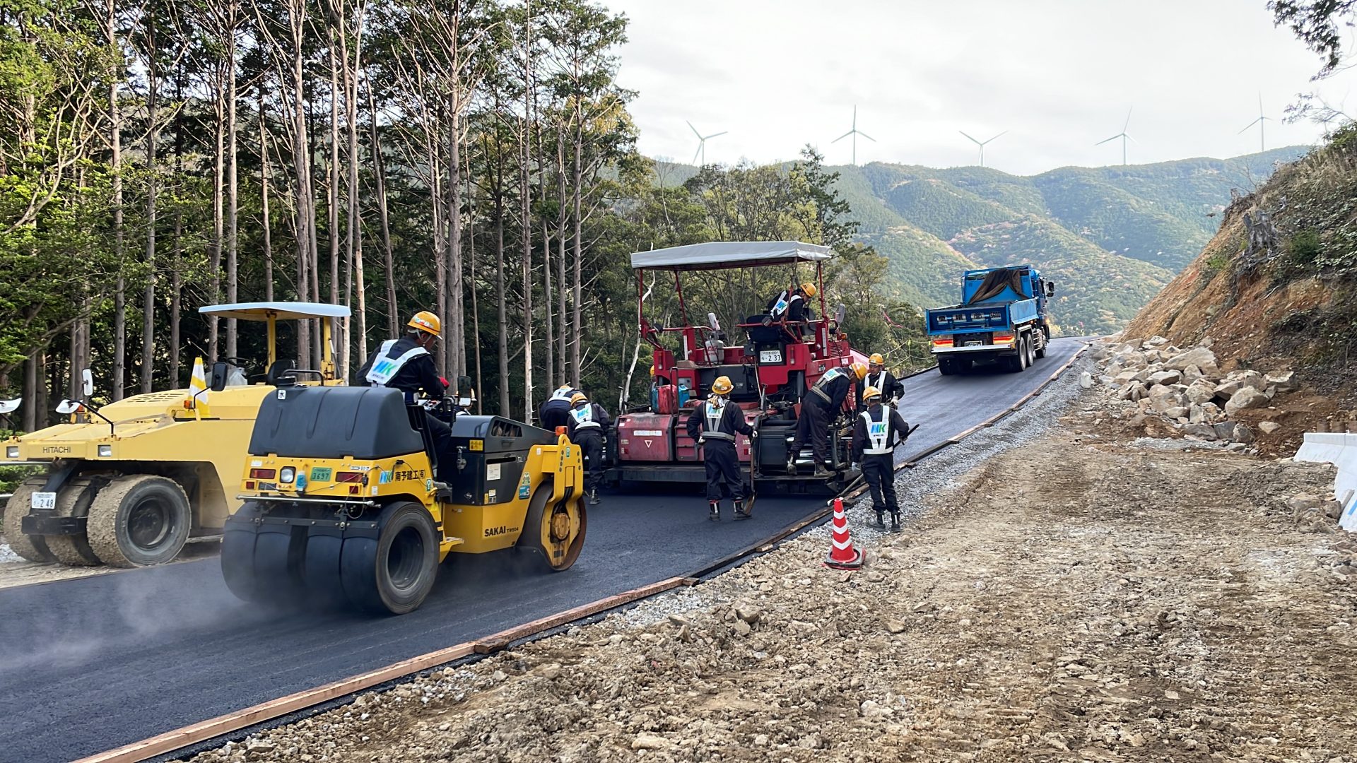 #アスファルト舗装#道路工事 愛南町柏新内海トンネル工事用道路 2023年3月 愛南町柏 新内海トンネル工事用道路を施工しました。 大型道路計画の工事迂回路です。 アスファルトフィニッシャ2台同時施工で仕上がり良好でした。 一覧に戻る